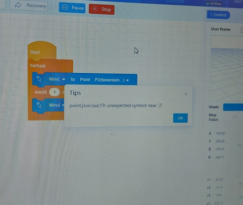 Bij opdracht 2 moest er een blokje opgetild worden en terug gelegd worden. Toen ik het probeerde ging het eerst fout omdat ik was vergeten om bij het laatste punt een point neer te zetten in de code. Daarom liet de robotarm het blokje vallen.